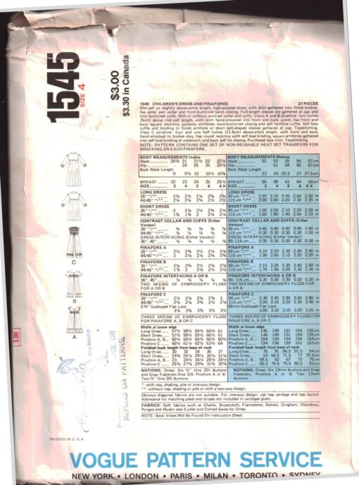 Vogue 1545 Girl’s Dress, Pinafore with transfers for smocking Size: 6 Uncut Sewing Pattern