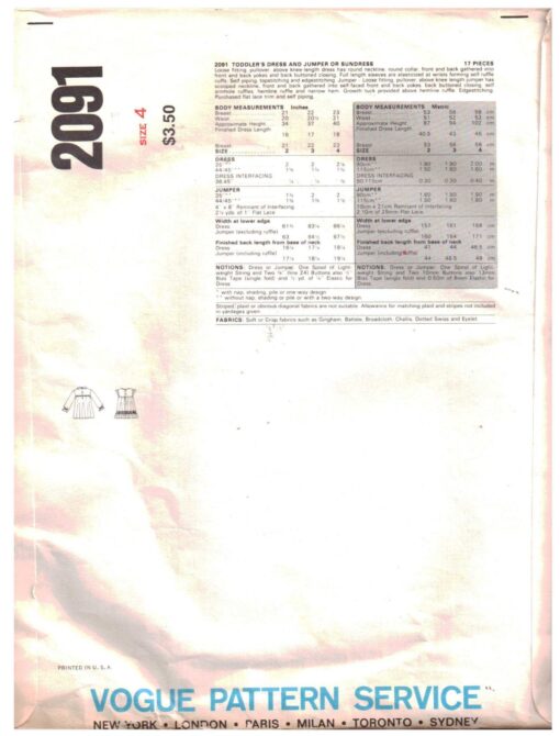 Vogue 2091 Girl’s Dress, Jumper, Sundress Size: 4 Uncut Sewing Pattern