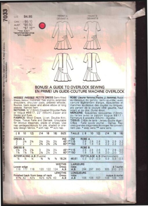 Vogue 7033 Dress Size: 8-10-12 Used Sewing Pattern