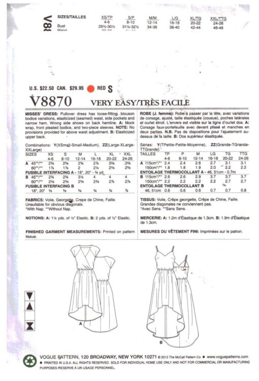 Vogue V8870 Dress Size: Y XS-S-M Uncut Sewing Pattern