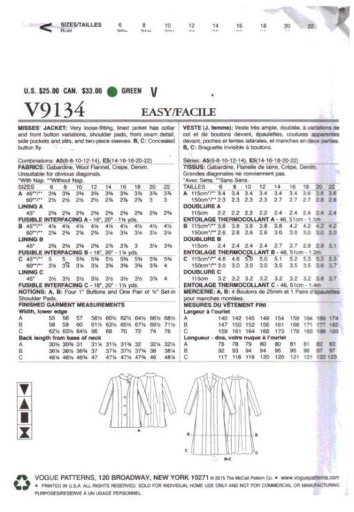 Vogue V9134 Jacket Size: E5 14-16-18-20-22 Uncut Sewing Pattern